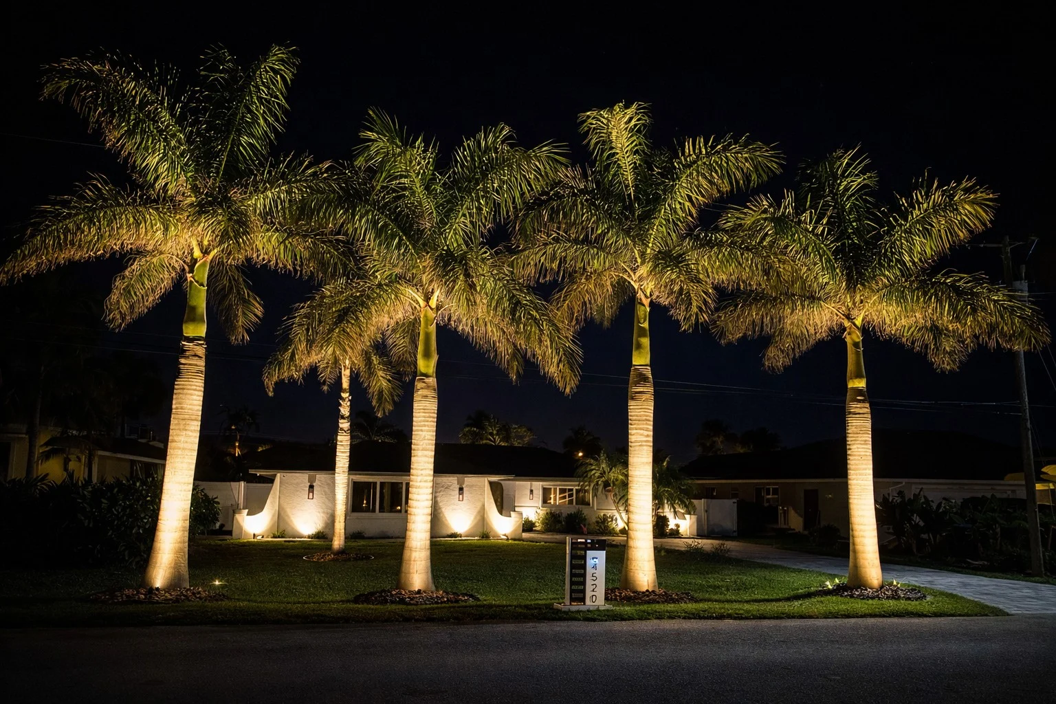 This Cape Coral outdoor lighting project was designed to blend architectural lighting with functional pathway illumination while introducing a creative alternative to traditional path lights. The homeowner wanted a clean, modern lighting solution that would enhance safety, define walkways, and highlight both the front façade and rear palms.