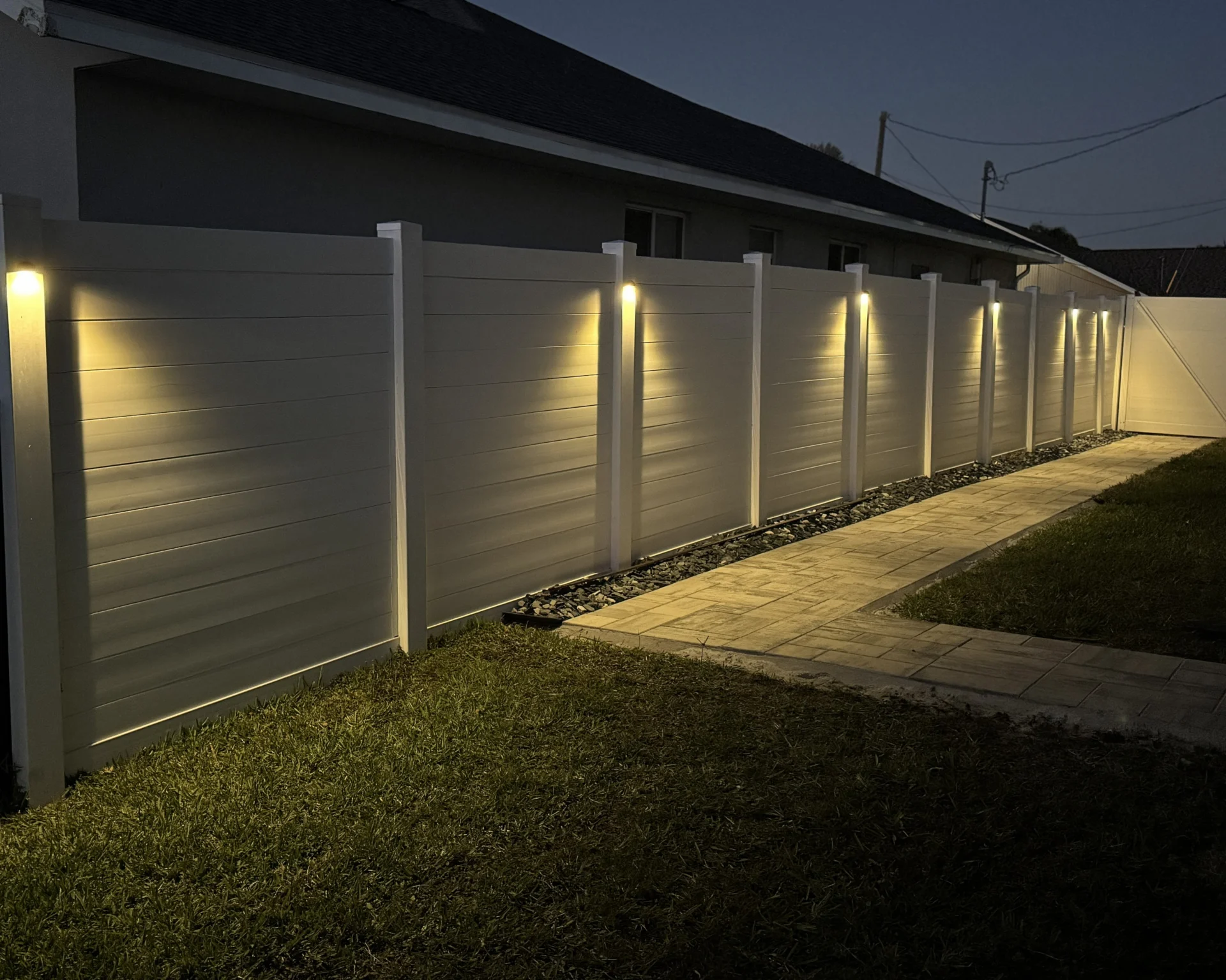 We installed Garden Light LED up lights to accent the home’s façade and royal palms, creating balanced illumination that enhances depth and curb appeal after dark. For the side yards and walkways leading to the rear of the property, we proposed a unique fence-mounted lighting approach. Rather than using standard path fixtures, low-profile deck lights were installed along the fence line, delivering consistent, glare-free illumination that improves visibility while adding a sleek architectural detail.