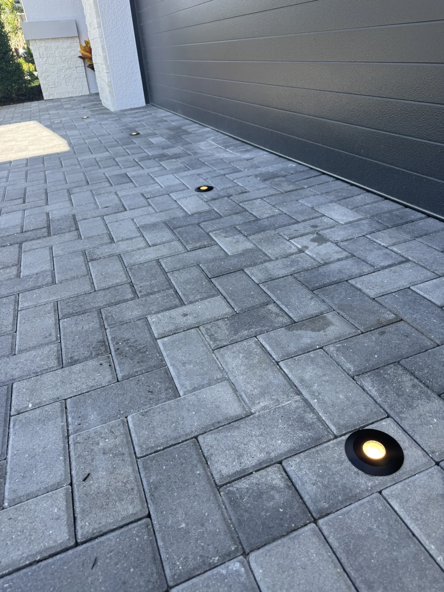 For the front of the home, Dauer Icon up lights were installed to accent the Montgomery and Christmas palms, creating dramatic shadowing that plays beautifully across the home’s white brick and textured stucco. In-grade well lights were core-drilled into the driveway to subtly illuminate the garage and upper façade, maintaining a clean, minimalist appearance.
