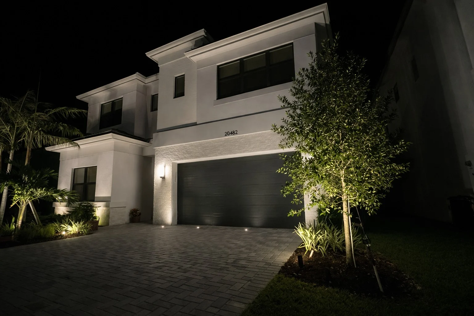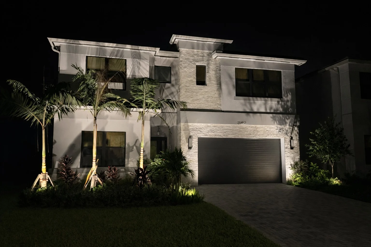 This Estero outdoor lighting project was designed to complement a modern home with clean architectural lines and contemporary materials. The homeowner wanted a refined lightingsolution that would enhance the façade while providing practical illumination in the backyard for nighttime use.