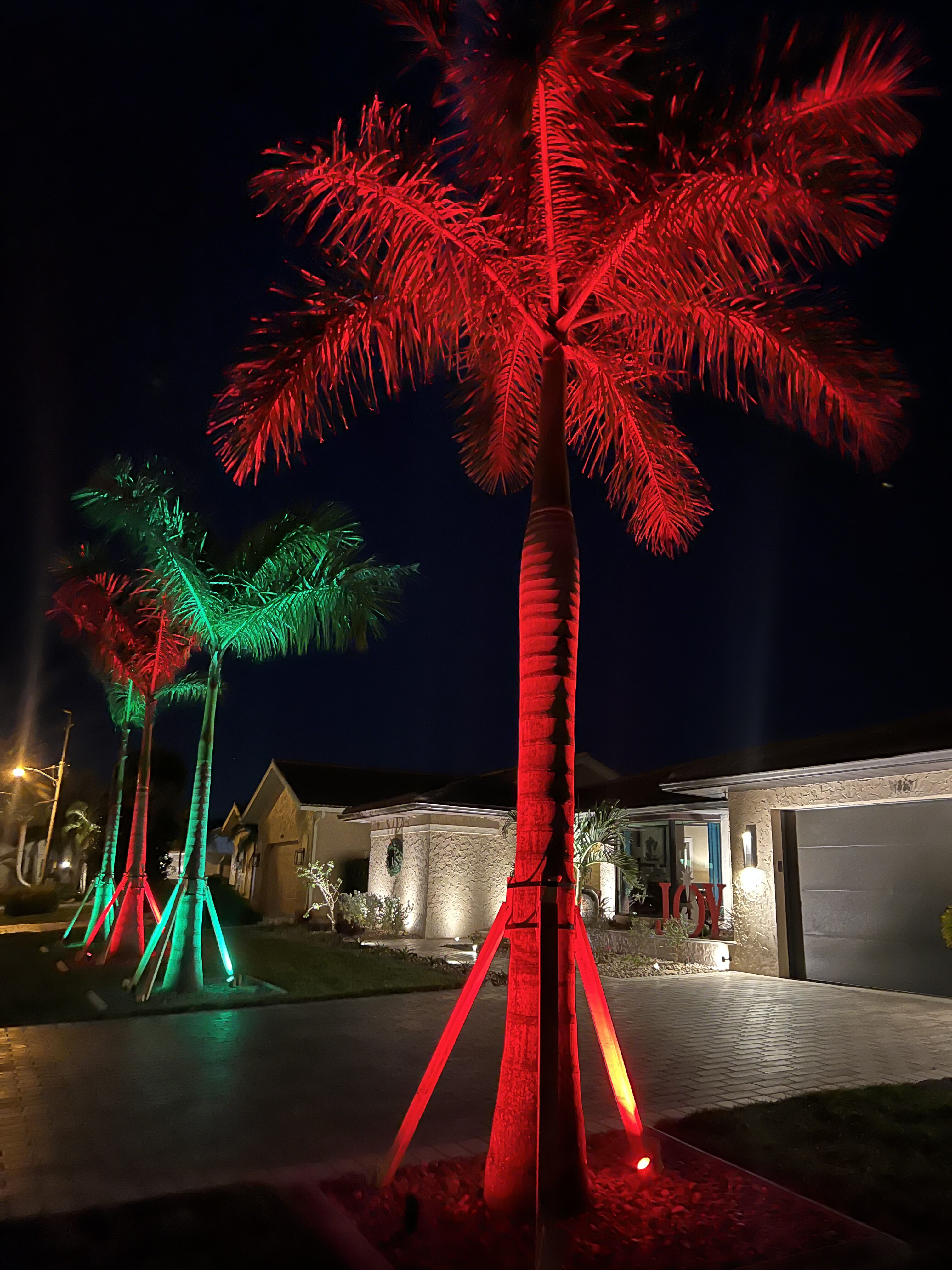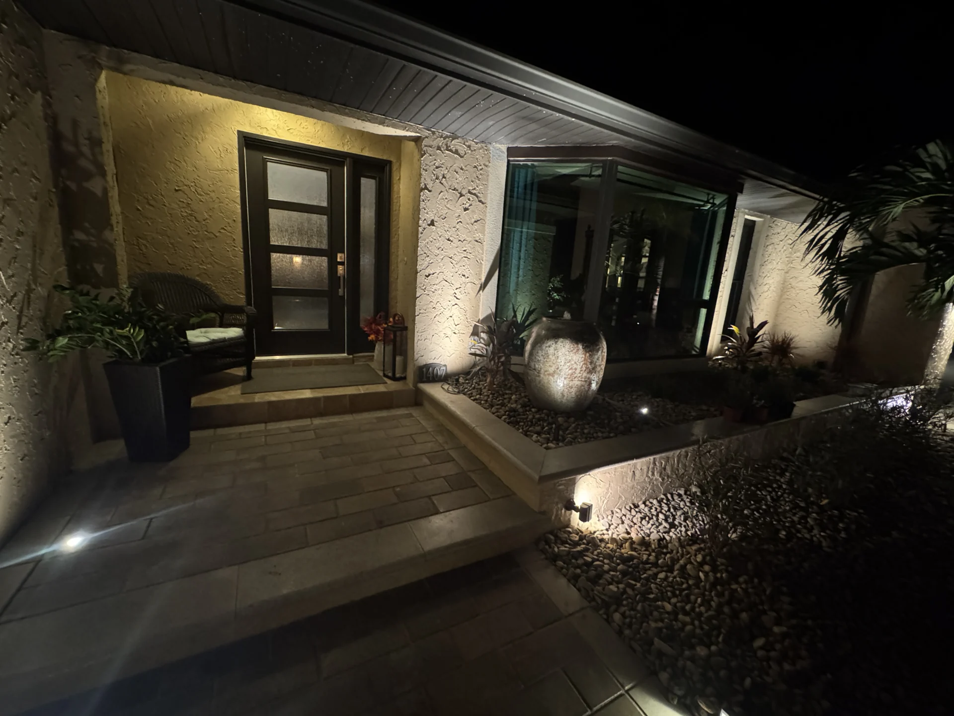 Large royal palms were illuminated both from the street and interior viewpoints, creating dramatic vertical accents that anchor the composition. A custom water-feature vase near the entry was highlighted using reflective lighting techniques, producing a shimmering focal point that adds movement and sophistication to the arrival experience. Garden Light LED pathway lights were installed along the new walkway, creating a clean, patterned glow that enhances both safety and visual flow.
