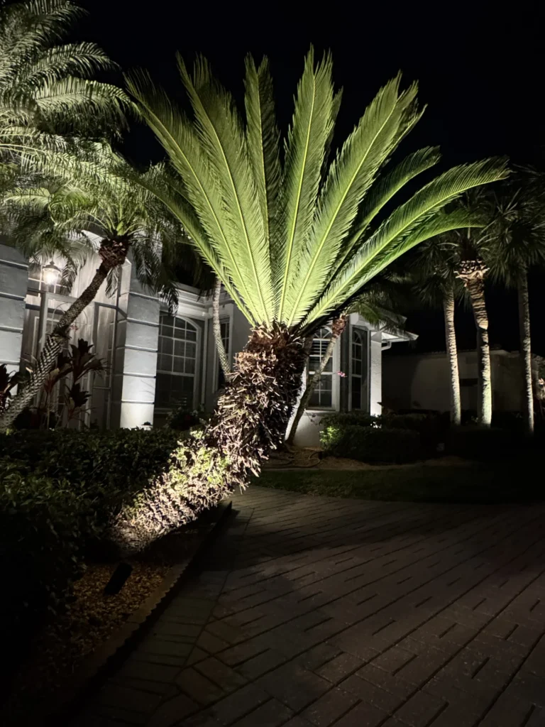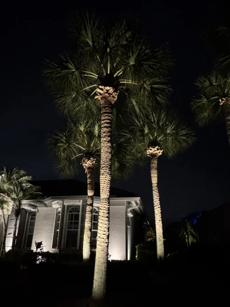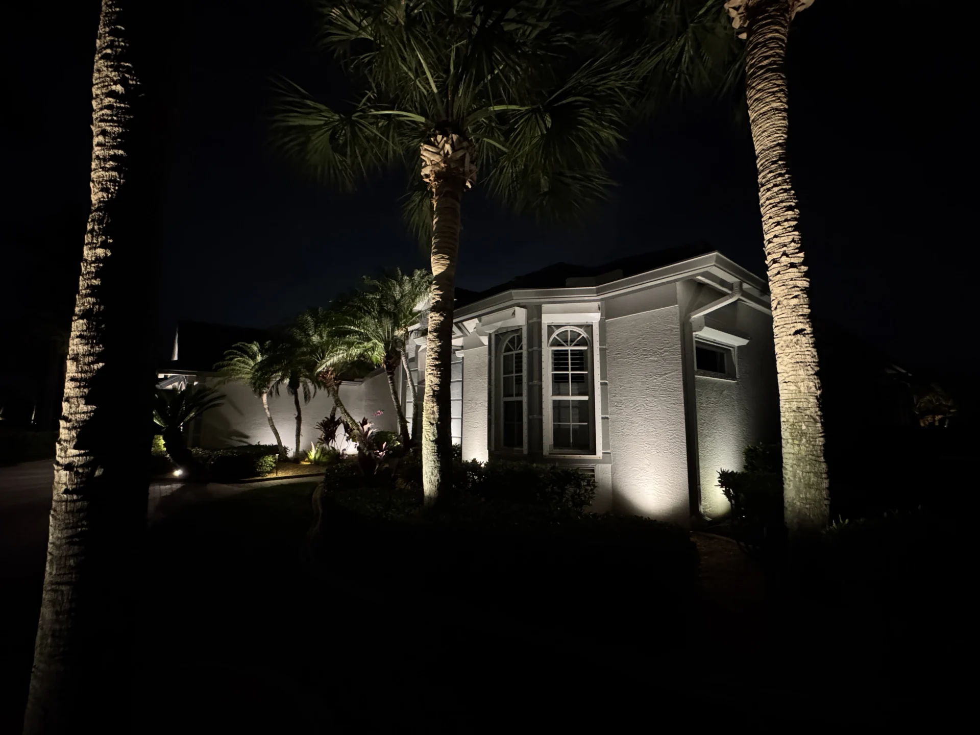 We installed a Platinum-Level outdoor lighting system powered by a Sterling 300-watttransformer, delivering premium performance and long-term reliability. Mature Royal Palms, Cabbage Palms, and Pygmy Date Palms were illuminated with Sterling SL01 up lights, accentuating their height, texture, and graceful structure.
